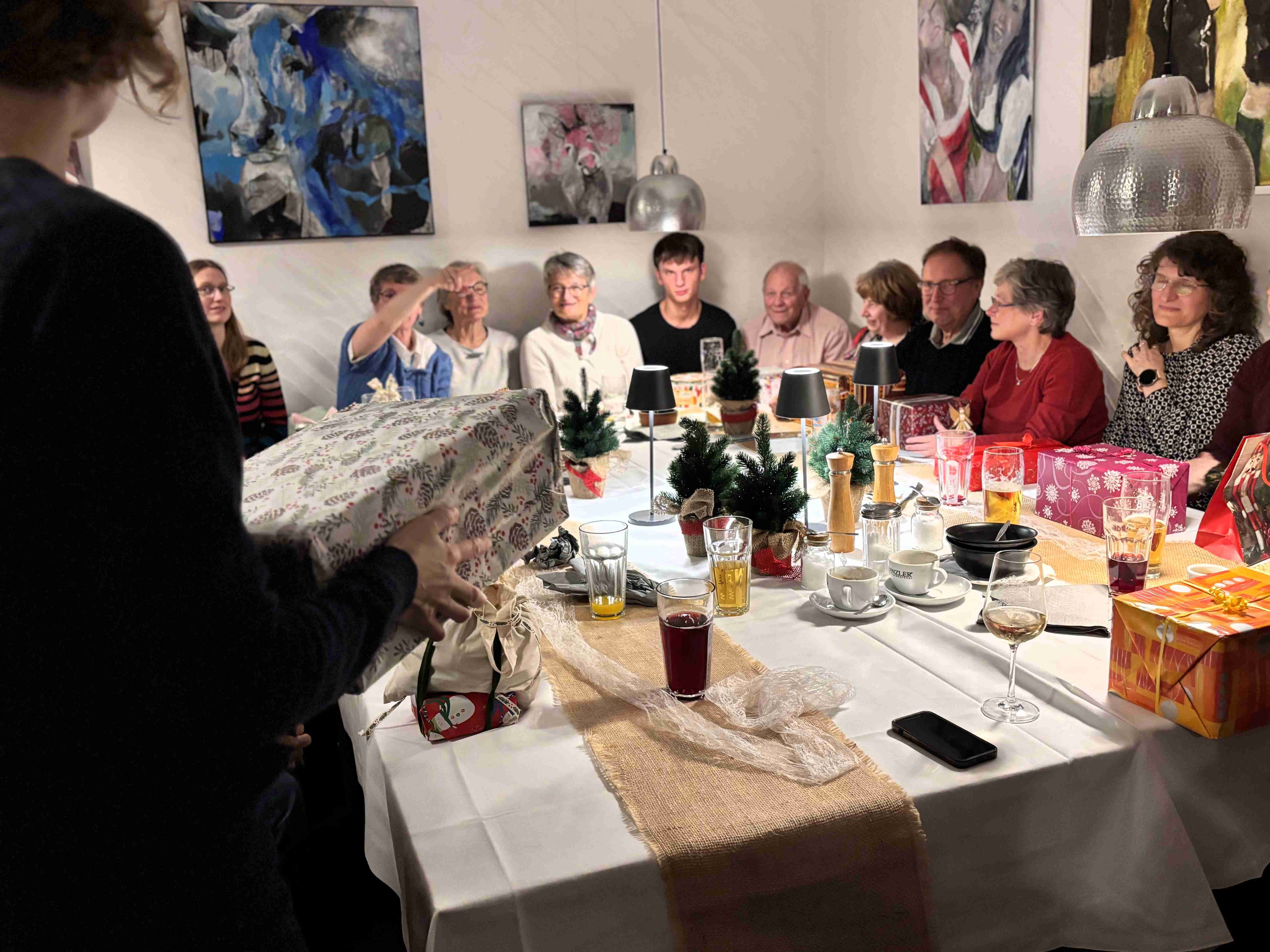 Sie sind hier: Startseite > Archiv > Archiv 2025 > Weihnachtsfeier 11.12. Weihnachtsfeier 11.12.Das Jahr ließen die Vereinsmitglieder zusammen bei einem Abendessen im Purfinger Haberer ausklingen. Es wurde gelacht, gequatscht und Geschenke beim Schrottwichteln per Zufall getauscht. Nun freut sich der Verein auf das neue Jahr, denn es wird aufregend. Es wird nicht nur Jahr des Akkordeons, nein, wir feier auch 20 Jahre Accordeonissimo e.V.!